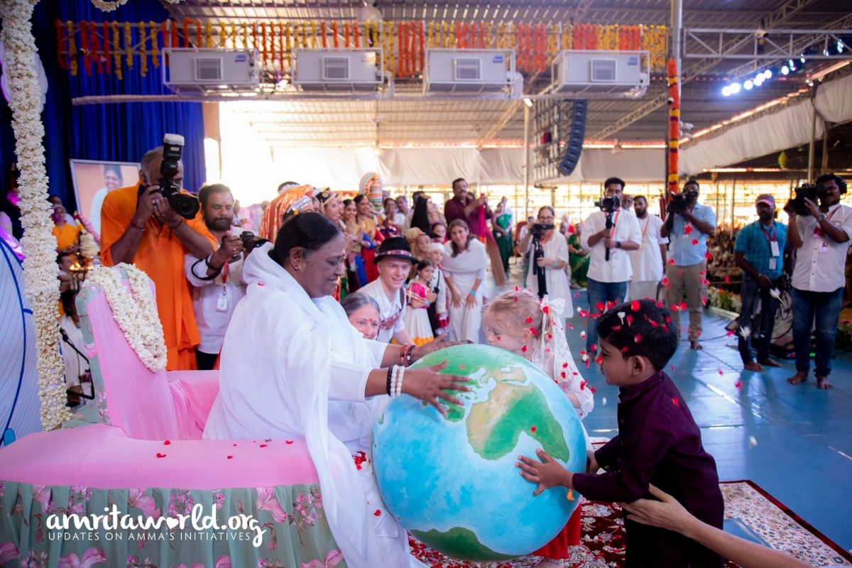 Kinder, wenn Amma euch hier heute in Liebe vereint versammelt sieht, fühlt es sich für sie an, als betrachtete sie eine Girlande aus vielen schönen Blumen unterschiedlichster Farben. Obwohl dies eine Zeit des Feierns ist, fühlt Amma eine Menge Schmerz, wenn sie an die leidenden Menschen in vielen Teilen der Welt denkt, die von Kriegen, Naturkatastrophen, Ausschreitungen und Gewalt heimgesucht werden. Extremes Wetter mit übermäßiger Sommerhitze und unablässigen Regenfällen, Naturkatastrophen und Epidemien haben Kerala und anderen Bundesstaaten Indiens hart zugesetzt.